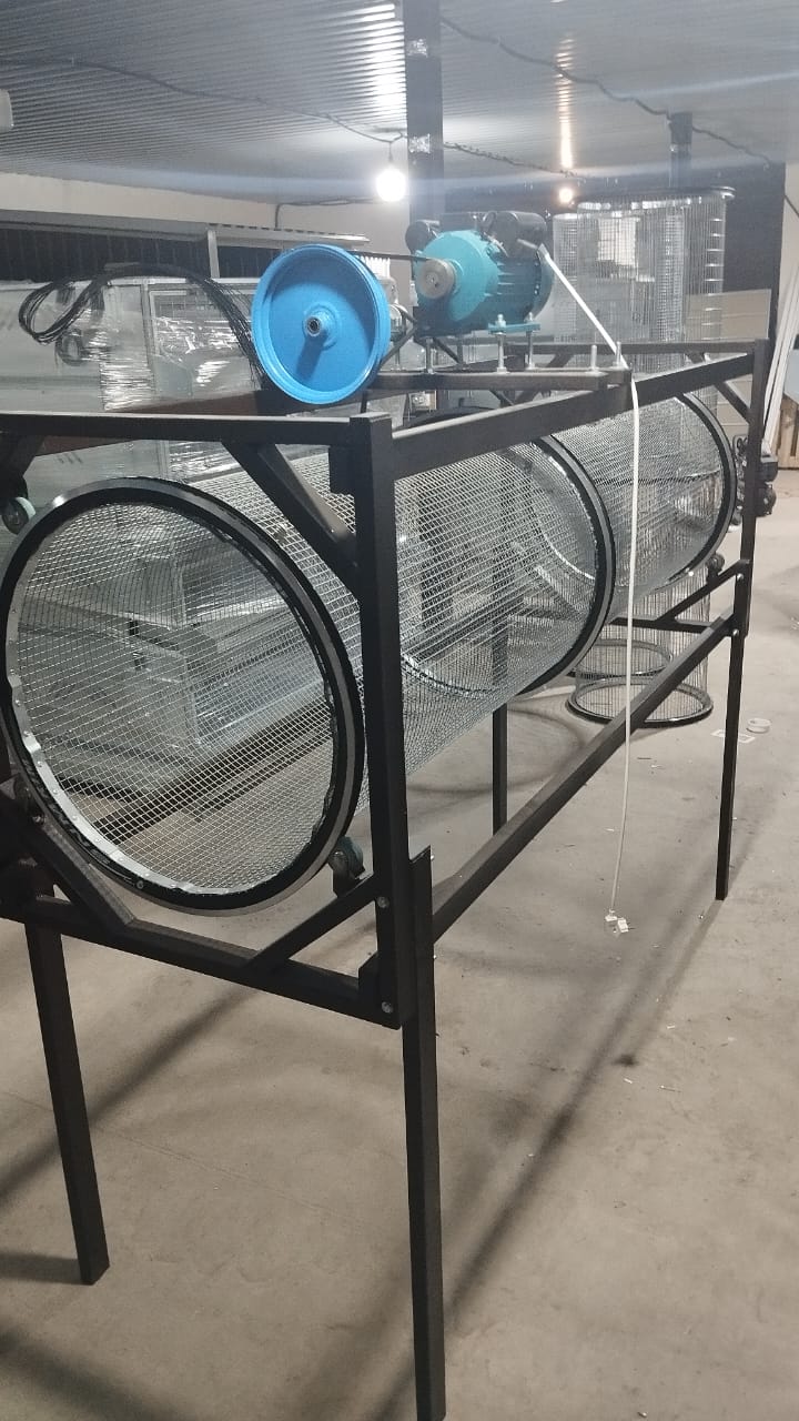 Двигатель приводит в движение оси барабана для вращательного движения. Редуктор способствует вращению и скорости вращения самого барабана. Сырье засыпается в барабан вручную с помощью лопаты через боковое отверстие с одной стороны. Под действием центробежной силы, материал попадает под эффект потоков и просеивается через сетку. Просеивание происходит постепенно. Конечный материал с мелкими частицами будет просеиваться через ячейки вниз барабана, а более крупные фракции будут падать вниз в противоположное боковое отверстие, что исключает возможность смешивания.