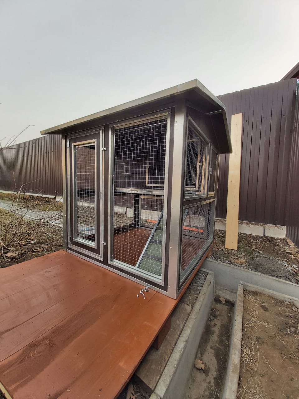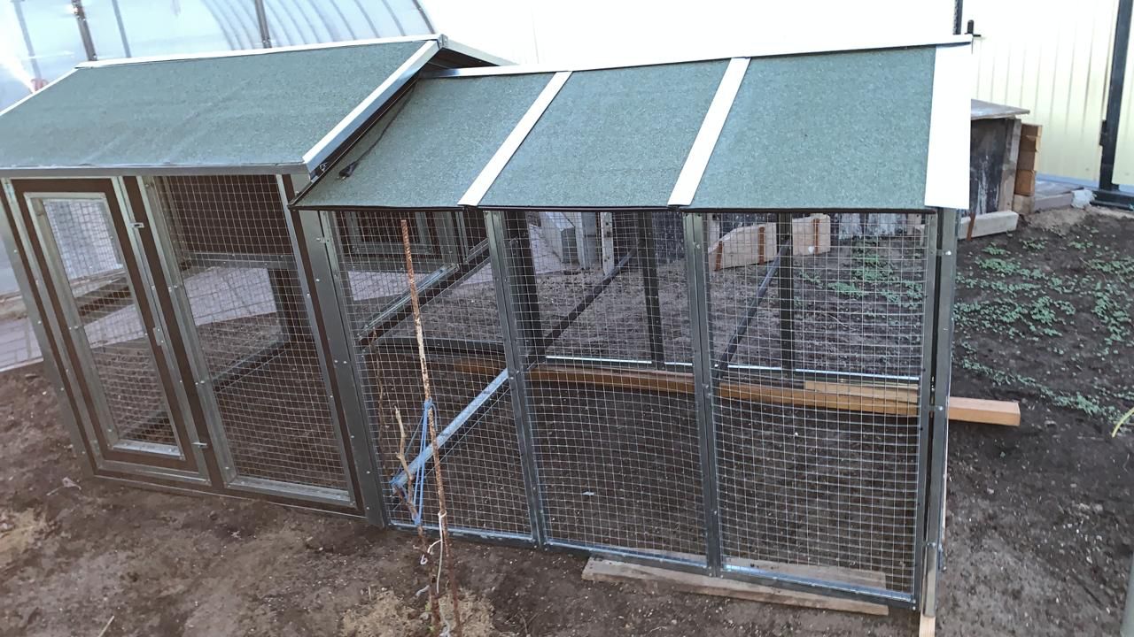 Домик оборудован прозрачным пластиковым выгулом, который легко можно сменить на оцинкованную сетку в летний период. Компактные размеры домика позволяют установить его на небольшой площади приусадебного участка.