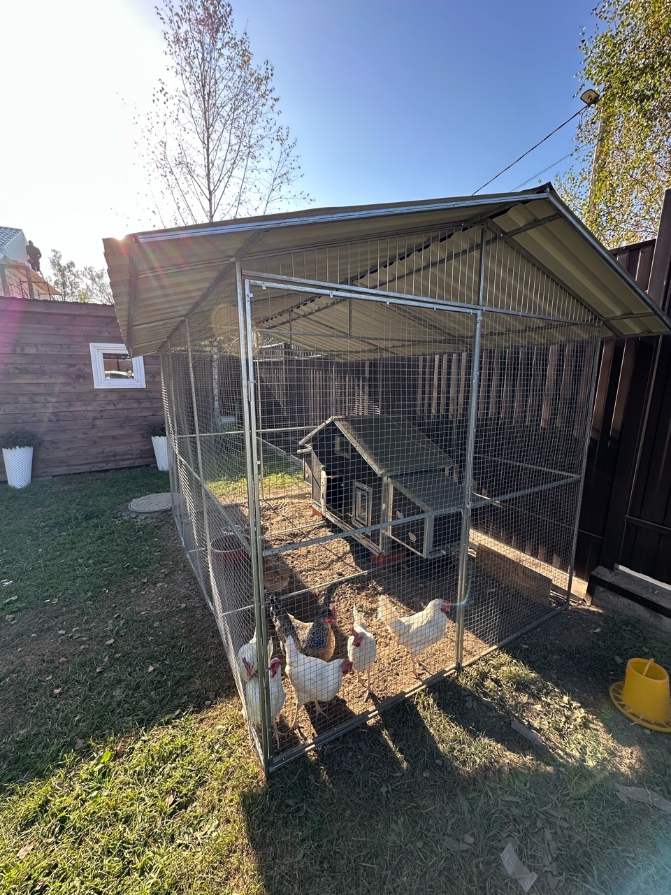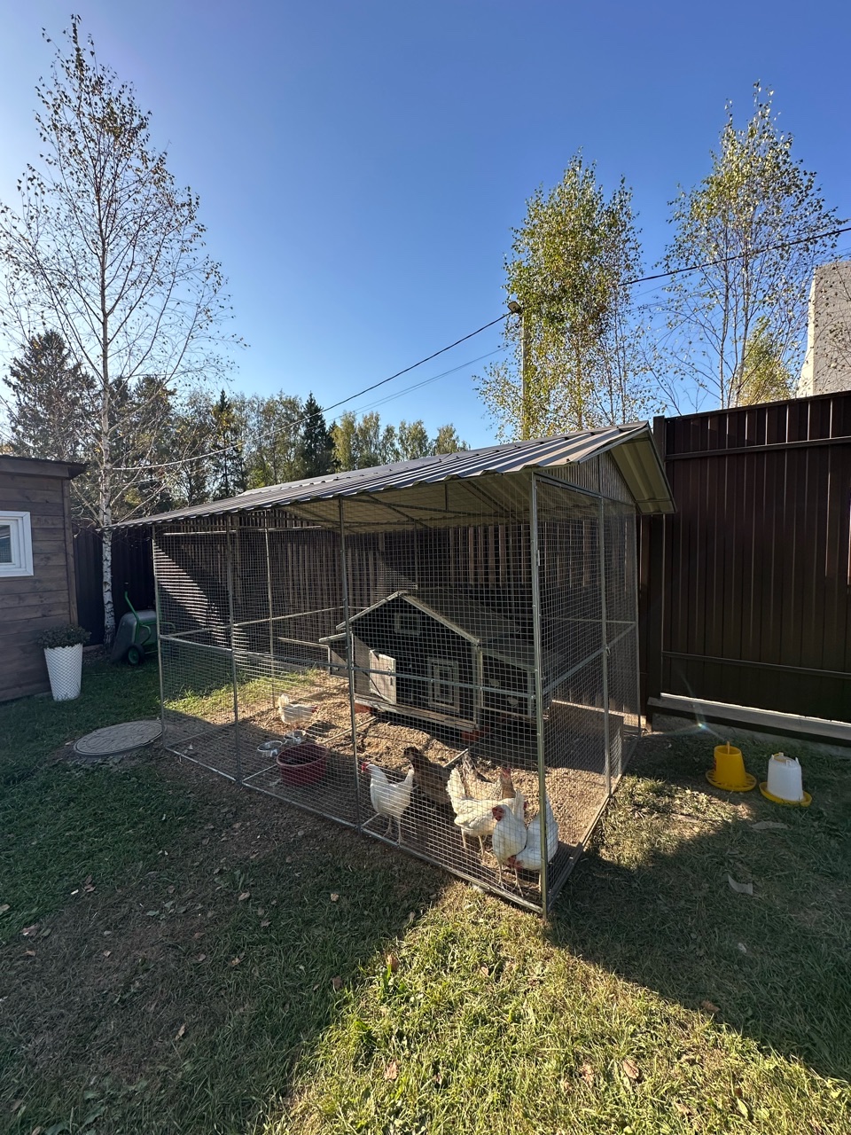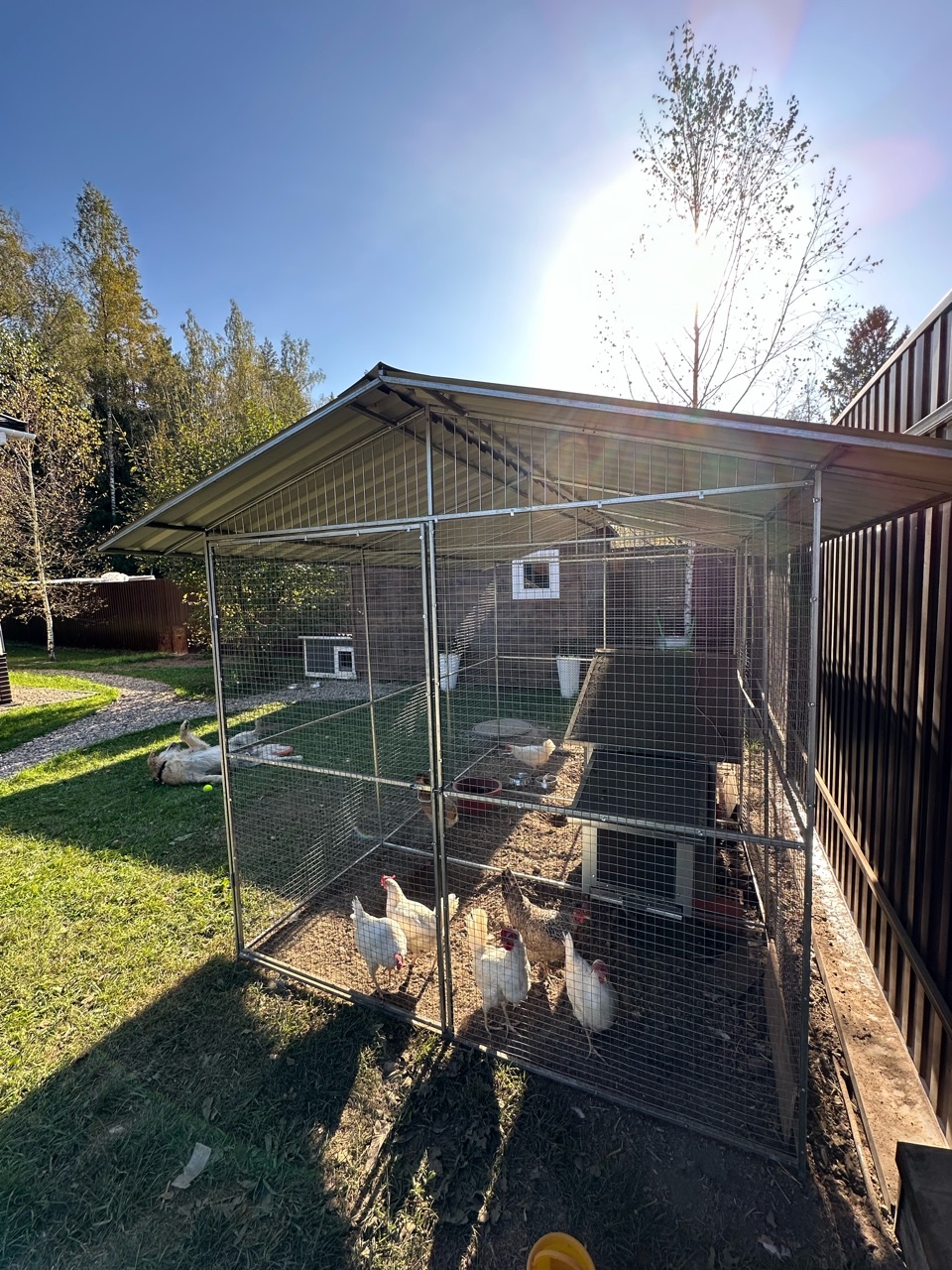 Конструкция является мобильной. В любой момент выгул можно переместить с места на место, например, где больше зеленой травы. В комплекте с выгулом идет кормушка и поилка. Внутрь выгула возможно установить небольшой курятник.