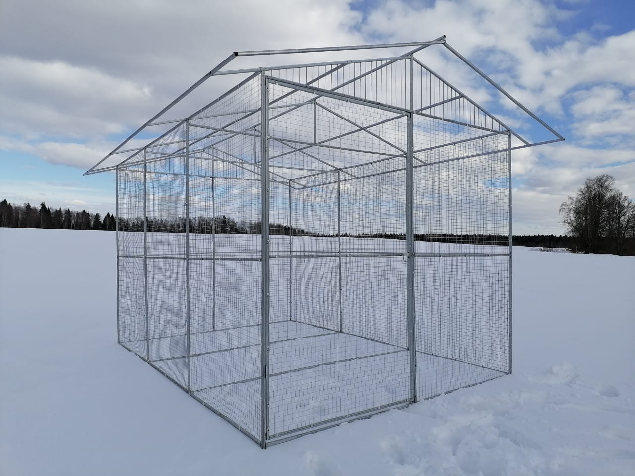 «Разгуляй» имеет усиленный каркас из оцинкованных труб. Внизу выгул так же усилен дополнительными планками из оцинкованных труб, дополнительно и на пол возможно установить сетку.
