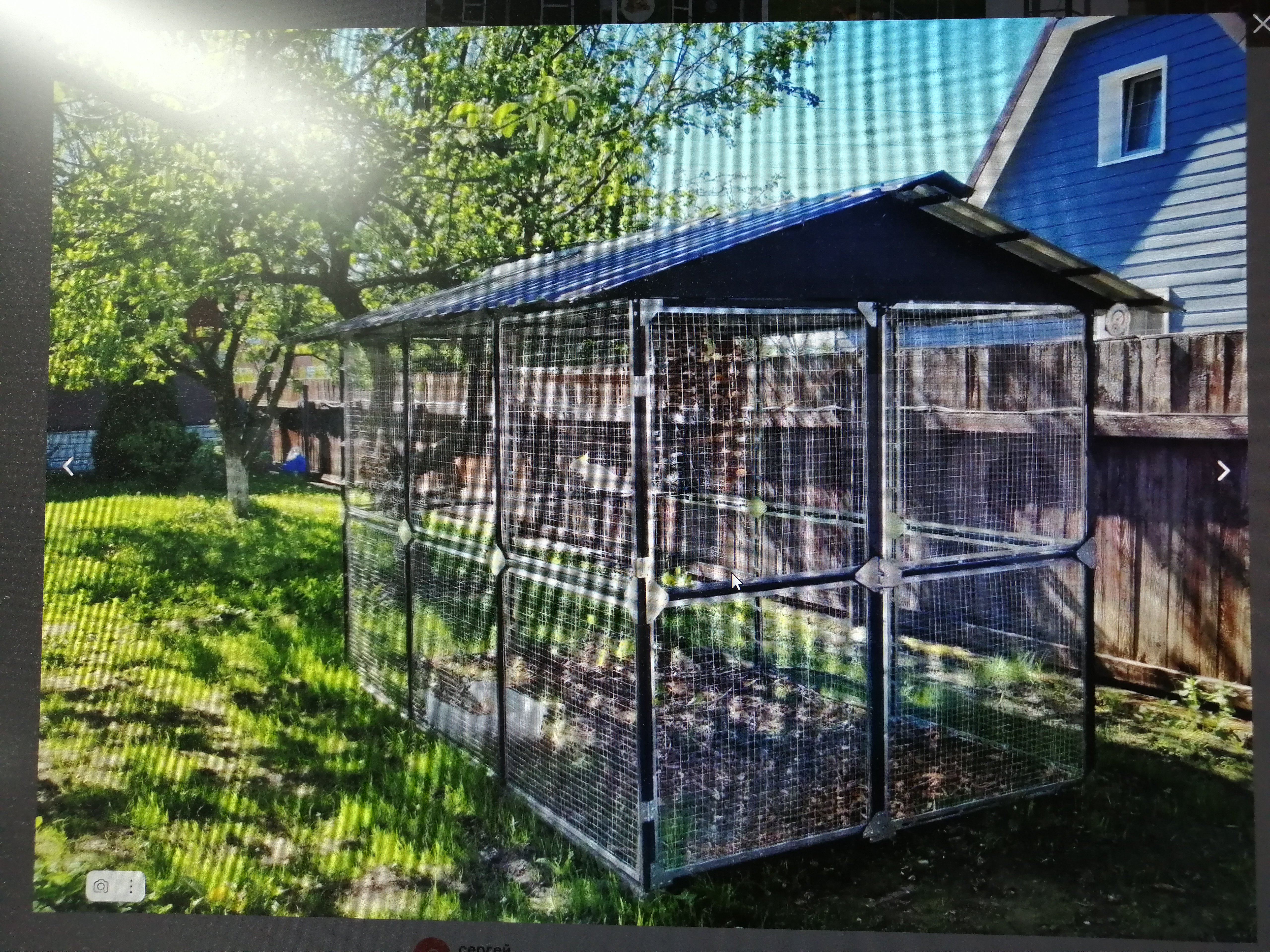 «Разгуляй» имеет усиленный каркас из оцинкованных труб, оборудован крышей из профильного металлического листа коричневого. Внизу выгул так же усилен дополнительными планками из оцинкованных труб, дополнительно и на пол возможно установить сетку.